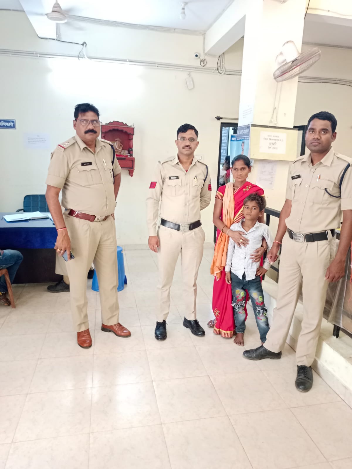 बिलासपुर/-आज दिनांक 24.4. 22 को प्रातः 11:30 बजे सूचक श्रीमती ललिता डेहरिया पति दिलीप लहरिया उम्र 35 साल निवासी ग्राम मोहदा थाना बिल्हा जिला बिलासपुर थाना उपस्थित आकर थाना प्रभारी के समक्ष पेश होकर सूचना दी कि वह अपने परिवार के साथ कल दिनांक 23.4. 2022 को काम करने के लिए राजकिशोर नगर स्थित रानू नामदेव टिफिन सेंटर में आई है, उसके साथ उसका 8 साल का बेटा सत्या डेहरिया भी था जो आज दिनांक 24.4 .2022 को प्रातः घर से ₹10 लेकर दुकान बिस्कुट लेने के लिए गया था जो घर नहीं पहुंचा है नाबालिक बच्चे की घर नहीं पहुंचने की सूचना को थाना प्रभारी द्वारा गंभीरता से लेते हुए तत्काल मौके पर स्टॉप रवाना कर बालक के खोजबीन में लगाया गया जो सरकंडा थाना पुलिस स्टाफ द्वारा लगातार प्रयास कर 4 घंटों के अंदर बालक को स्मृति वन के पास से बरामद कर सूचक मां ललिता डेहरिया के सुपुर्द नामा पर दिया गया बालक की मां द्वारा सरकंडा पुलिस को नम आंखों से धन्यवाद आभार व्यक्त किया गया है।