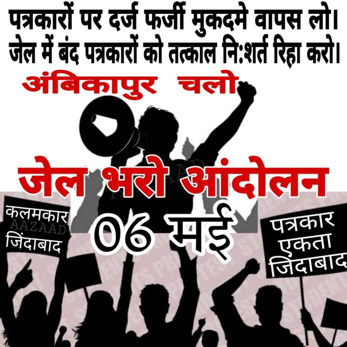 अम्बिकापुर-: छत्तीसगढ़ का सबसे बड़ा संगठन अखिल भारतीय पत्रकार सुरक्षा समिति छत्तीसगढ़ के द्वारा प्रदेश में सरकार एवं प्रशासनिक अत्याचार बन्द करने , बिना जांच पत्रकारों पर हुई एफआईआर की वापस लेने एवं जेल में बंद पत्रकारों को नि:शर्त रिहा के साथ प्रदेश में पत्रकार सुरक्षा कानून लागू किया जाए को लेकर 6 मई को अम्बिकापुर में प्रदेश स्तरीय धरना,ज्ञापन एवं जेलभरो आंदोलन किया जाएगा । धरना प्रदर्शन में प्रदेश के हजारों की संख्या में पत्रकार अम्बिकापुर में पहुँचने की बात कहि है।