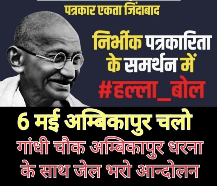 अम्बिकापुर-: छत्तीसगढ़ का सबसे बड़ा संगठन अखिल भारतीय पत्रकार सुरक्षा समिति छत्तीसगढ़ के द्वारा प्रदेश में सरकार के आधीन प्रशासनिक अधिकारियों,पुलिस प्रशासन के अत्याचार बन्द करने , बिना जांच पत्रकारों पर हुई एफआईआर की वापस लेने एवं जेल में बंद पत्रकारों को नि:शर्त रिहा के साथ प्रदेश में पत्रकार सुरक्षा कानून लागू किया जाय को लेकर 6 मई को अम्बिकापुर में प्रदेश स्तरीय धरना,ज्ञापन एवं जेलभरो आंदोलन किया जाएगा,धरना प्रदर्शन में प्रदेश के समाजिक संगठनों,राजनीतिक संगठनों ,बार एसोसिएशन के साथ हजारों की संख्या में पत्रकार अम्बिकापुर में पहुँचने रहे है।