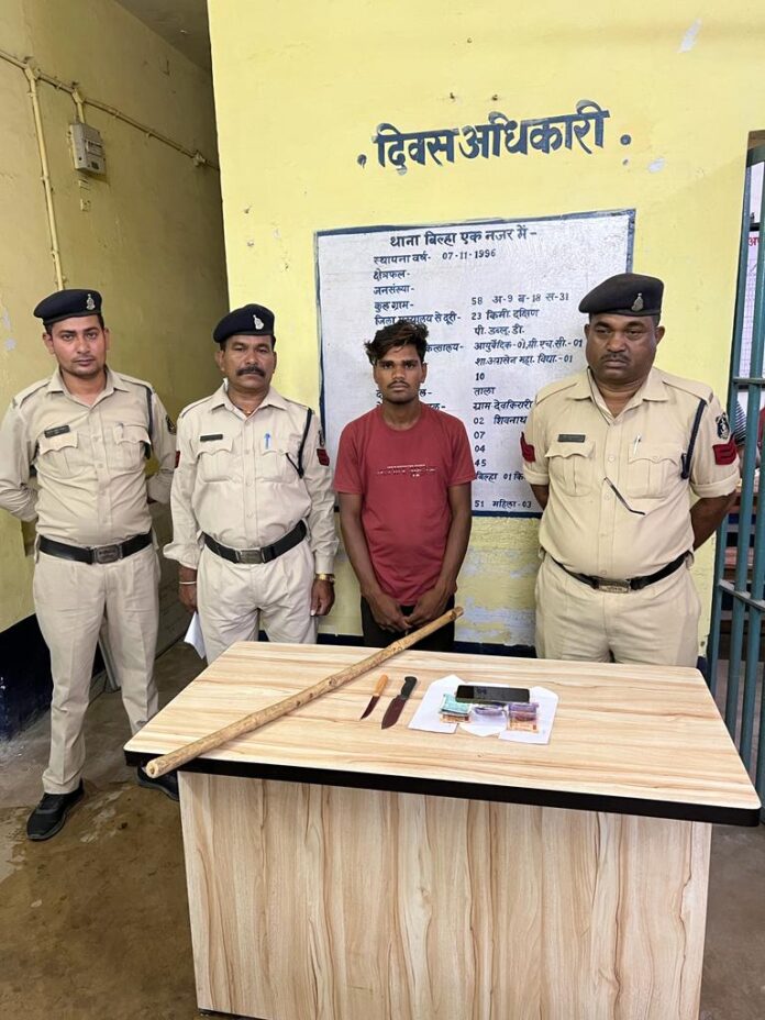 बिलासपुर/-दिनांक 04.05.2022 को प्रार्थी विक्रम दिव्य पिता सोनउ राम उम्र 22 साल निवासी ठाकुर देवा चौकी मल्हार थाना मस्तूरी का थाना उपस्थित आकर बताया कि दिनांक 28.04.2022 के रात्रि करीब 08.00 बजे अपने गांव से अपनी मोटर सायकल हीरा होण्डा स्प्लेंडर प्लस क्रमांक सीजी 04 डी डब्लू 2413 में अपने दोस्त उत्तम दास शांडिल्य, यशवंत दास मानिकपुरी के साथ शादी में बिलासपुर गये थे वापस तीनो मोटर सायकल से गांव आ रहे थे तो ग्राम बुंदेला में रात्रि करीब 01.00 बजे मोटर सायकल का सामने चक्का पंचर हो गया बनाने हेतु कोई साधन नही मिलने से प्रार्थी एवं उनके दोस्त मोटर सायकल को पैदल ही अपने गांव जाने लगे करीब 02.30 बजे ग्राम खम्हारडीह पासीद के बीच पहुंचे थे कि रोड के पास 03 अज्ञात व्यक्ति मिले जिनके पास चाकू छुरी डंडा रखे थे प्राथी व उनके दोस्तो को रूकवाये और धमकाते हुए कहने लगे जो कुछ सामान तुम्हारे पास है निकाल दो नही तो तुम लोगो को चाकू मार देगे तब वे तीनो कुछ नही रखे है बोलने पर प्रार्थी के पैंट जेब में रखे नगद रकम 3000 रूपये एवं हाथ में रखा मोबाईल Xiaomi 11 i 5G को बल पूर्वक लूट कर भाग गये कि रिपोर्ट पर अपराध पंजीबद्ध कर विवेचना में लिया गया। मामले की गंभीरता को देखते हुये तत्काल श्रीमान उ0म0नि0 एवं वरिष्ठ पुलिस अधीक्षक महोदय श्रीमती पारूल माथुर के निर्देेश पर तथा श्रीमान अतिरिक्त पुलिस अधीक्षक महोदय ग्रामीण श्री रोहित कुमार झा तथा नगर पुलिस अधीक्षक महोदय चकरभाठा सुश्री गरिमा द्विवेदी ( अति. पुलिस अधीक्षक ) के मार्गदर्शन में लूट की घटना को रोकथाम के लिए टीम गठित कर अज्ञात आरोपियों का पता साजी कर उक्त प्रकरण में 01 आरोपी को तथा 02 विधि का उल्लंघन करने वाला बालक को गिरफ्तार कर उनके कब्जे से लूट गये रकम 1050 रूपये तथा मोबाईल एवं घटना में प्रयूक्त चाकू छुरी एवं बांस का डंडा को जप्त किया गया। इस कार्यवाही में ACCU बिलासपुर एवं बिल्हा पुलिस का विशेष योगदान रहा।
