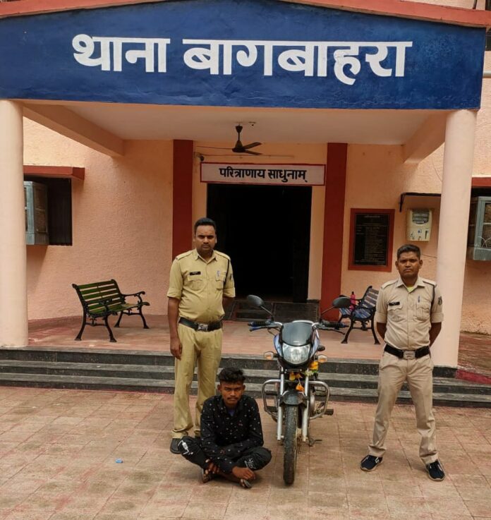 बागबाहरा थाना क्षेत्र का मामला पुलिस अधीक्षक महोदय भोजराम पटेल एवं अतिरिक्त पुलिस अधीक्षक महोदया मेघा टेम्भूरकर साहू व अनुविभागीय अधिकारी (पुलिस) बागबाहरा श्री कपिल चन्द्रा द्वारा जिलें के सभी थाना प्रभारियों को शहर एवं देहात में हो रही चोरी की रोकथाम करने एवं कार्यवाही करने हेतु निर्देशित करने पर दिनांक 06/07/2022 को प्रार्थी अपने मोटर सायकल हीरो एचएफ डिलक्स क्र CG 06 GM 9508 से आदित्य अस्पताल बागबाहरा ड्यूटी गया हुआ था रात्रि 11.00 बजे डियुटी से वापस आकर अपने मोटर सायकल को मकान के बाहर खड़ी कर घर अंदर चला गया जब सुबह 05.00 बजे उठकर देखा तो प्रार्थी के मोटर सायकल बाहर में नही था आसपास पता तलाश किया पता नही चला प्रार्थी के मोटर सायकल हीरो एचएफ डिलक्स क्र CG 06 GM 9508 जिसकाचेंचिसनंMBLHAR233JHG14980 इंजन नंबर HA11ENJHG21618 कीमती 15000 रूपये को किसी अज्ञात चोर द्वारा चोरी कर ले गया है कि प्रार्थी की रिपोर्ट पर थाना बागबाहरा में अपराध क्रमांक 132/2022 धारा 379 भादवि का अपराध पंजीबद्ध कर विवेचना में लिया गया है। विवेचना के दौरान पता साजी करने पर एक संदिग्ध व्यक्ति मिला जिसे चोरी करने के संबंध में पूछताछ करने पर टाल मटोल करने लगा कडाई से पूछताछ करने पर आरोपी संदीप बाघ पिता तेजू बाघ उम्र 19 साल साकिन लाठोर थाना लाठोर जिला बलांगीर उडिसा के द्वारा अपराध स्वीकार करने पर आरोपी के कब्जे से एक मोटर सायकल हीरो एचएफ डिलक्स क्र CG 06 GM 9508 कीमती करीबन 15,000 रूपये को बरामद किया गया आरोपी संन्दीप बाघ को समय सदर में गिरफ्तार किया गया है । सम्पूर्ण कार्यवाही में थाना प्रभारी स्वराज त्रिपाठी , प्रधान आरक्षक भूपेंद्र चंद्राकर, आरक्षक शंकर ठाकुर ,एकलब्य बैस का विशेष योगदान रहा।
