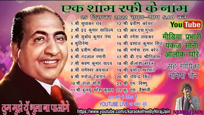 बिलासपुर/-मोहम्मद रफी के जन्मदिन पर आयोजित कार्यक्रम जैसा कि आप सभी संगीत प्रेमी जानते है दिनाँक 24 दिसंबर को महान गायक मोहम्मद रफ़ी का जन्म दिन है । अतः रफ़ी साहब की जन्म जयंती समारोह मनाने हेतु 25 दिसंबर दिन रविवार को ऑर्केस्ट्रा म्यूजिक मेलोडी यदुनंदन नगर द्वारा *तुम मुझे यूँ भुला न पाओगे* कार्यक्रम आयोजित किया जायेगा।इस कार्यक्रम में रफ़ी साहब के गाये हुए गीतों को गाकर उन्हें याद किया जाएगा।जिसे यूट्यूब के माध्यम से लाइव प्रसारित किया जाएगा। जिसका लिंक https://youtube.com/@karaokefreeByNirajJain है। इस कार्यक्रम में शहर के कई संगीत प्रेमियों ने भाग लिया है ।जिसमे सुधाकर राव ,इंद्रकुमार सांडिल्य, सुबोध कुमार नेमा,श्रुति नेमा,प्रवीण श्रीवास, नंदलाल रमानी,श्रवण कुमार यादव,रामेश्वर अग्रवाल, मनोज देवांगन,राजा सोनी,बुलसु महेश कुमार,प्रवीण कोचर,राधेश्याम गुप्ता,रमेश ताम्रकर, प्रशांत कुमार सिंह,गणेश राम बरेठ, बी.एच. श्रीनिवास, कैलाश बघेल,प्रमोद खरपाठे,रविन्द्रसिह,एम.विष्णु,एमवैष्णवी, नितिन बेडेकर का इस कार्यक्रम के लिए चयन किया गया है । इस कार्यक्रम के मिडिया प्रभारी पंकज सोनी एवम आलोक घोरे है।यह कार्यक्रम नीरज जैन एवम मनीषा जैन द्वारा आयोजित किया गया है। आप सभी संगीत प्रेमियों से निवेदन है कि इस कार्यक्रम में यूट्यूब के माध्यम से जुड़कर कार्यक्रम का लाभ उठायें।