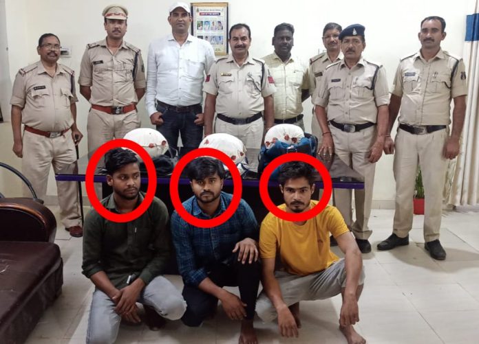थाना तारबाहर (1)राजु कुमार पिता गोपीचन्द शाह, उम्र 28 वर्ष, सा.गौखुला, थाना शिकारपुर, जिला पश्चिमी चम्पारण (बेतिया), बिहार, (2)अमित कुमार पिता अनिल प्रसाद लोनिया, उम्र 22 वर्ष, सा.जयसिंगपुर, थाना सिकटा, पोस्ट शिकारपुर, जिला पश्चिमी चम्पारण (बेतिया), बिहार, (3)संजय पटेल पिता सतेन्द्र पटेल, उम्र 19 वर्ष, सा.ग्राम बरदेही, थाना सिकटा, जिला पश्चिमी चम्पारण (बेतिया), बिहार