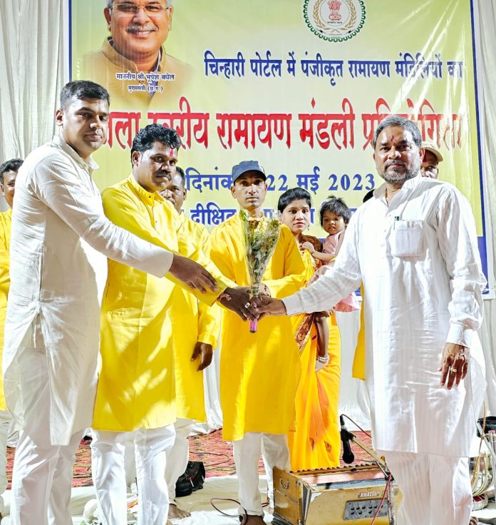 जिला पंचायत सभापति अंकित गौरहा ने कहा कि हमारा भारत देश एक समृद्ध संस्कृति और विरासत वाला देश है और हमारी परंपरा एवं संस्कृति के संरक्षण एवं संवर्धन के लिए मानस मंडली प्रतियोगिता का आयोजन किया जा रहा है मुख्यमंत्री की यह पहल बहुत ही सराहनीय है। इससे युवाओं को अच्छी शिक्षा के साथ अच्छा संस्कार भी मिलेगा। जिला पंचायत के सीईओ अजय अग्रवाल ने स्वागत उद्बोधन दिया। प्रतियोगिता में कोटा विकासखंड से अंगना के तुलसी मानस मंडली ग्राम पंचायत चुरेली, तखतपुर विकासखंड से तुलसी के चौरा मानस मंडली सिलतरा, मस्तूरी विकासखंड से जय मां काली मानस मंडली परिवार वेद परसदा एवं बिल्हा विकासखंड से राम सुधा रस मानस मंडली तिफरा ने श्रीरामचरितमानस के अरण्य कांड पर आधारित प्रस्तुतियां दी। इस अवसर पर निर्णायक मंडल के सदस्यगण, सहायक परियोजना अधिकारी आनंद पांडे सहित गणमान्य नागरिक उपस्थित थे मंच का संचालन सौरभ सक्सेना एवं कौशलेंद्र उपाध्याय ने किया।
