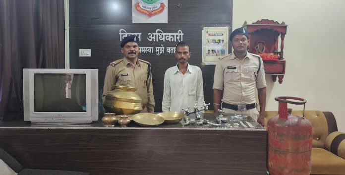 बिलासपुर/- सरकंडा थाना क्षेत्र का मामले का संक्षिप्त विवरण इस प्रकार है कि दिनांक 7-9-23 को प्रार्थी शेष कुमार साहू निवासी आशावन बिरकोना रोड थाना आकर रिपोर्ट दर्ज कराया की वह पिताजी की तबीयत खराब होने से 16-8-23 को अपने पिताजी को देखने भिलाई गया हुआ था कि दिनांक 6-9-23 को पड़ोसी ने फोन करके बताया कि इसके घर का ताला टूटा हुआ है और घर से सामान बिखरा हुआ है सूचना मिलने पर प्रार्थी अपनी पत्नी के साथ वापस बिलासपुर आकर घर में देखा तो घर का ताला टूटा हुआ था कमरे किचन का सामान बिखरा हुआ था घर में लगे नल के टोटी, कासा के बर्तन, सिलेंडर, टीवी तथा अन्य घरेलू सामान के साथ-साथ चांदी के पायल और बच्चों के चांदी के जेवर को कोई अज्ञात चोर चोरी करके ले गया है कि सूचना पर तत्काल अज्ञात चोर के विरुद्ध चोरी का अपराध पंजीकृत कर विवेचना में लिया गया तथा अज्ञात चोर का पता तलाश लगातार आसपास के क्षेत्र में किया जा रहा था इसी दौरान पुलिस टीम को सूचना मिला की एक व्यक्ति बंधव पारा के पास पुराने घरेलू सामान को बेचने के लिए ग्राहक तलाश कर रहा है कि सूचना पर पुलिस टीम तत्काल मौके पर पहुंची जहां एक व्यक्ति को पकड़ा गया नाम पता पूछने पर अपना नाम अजय यादव बंधवा पारा का रहना बताया पूछताछ करने पर प्रार्थी के घर दिनांक 6-9-23 को ताला तोड़कर चोरी करने की घटना स्वीकार किया आरोपी के कब्जे से चोरी गए चांदी के जेवर सहित टीवी, सिलेंडर तथा अन्य घरेलू सामान कीमती करीब ₹25000 को जप्त किया गया आरोपी को विधिवत गिरफ्तार कर न्यायिक रिमांड पर भेजा गया।