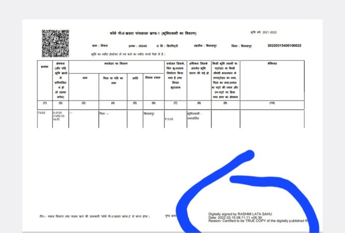 उसमें केवल शासन के आदेश से डिजिटल सिग्नेचर बस किया गया है…पटवारी किसी भी रिकॉर्ड को ख़ुद से नहीं सुधार सकता है जब तक की उसे तहसीलदार का आदेश न मिले….दूसरी तरफ़ जैसा आरोप पटवारी अचला तंबोली पर लग रहा है वैसा ही आरोप पूर्व सिरगिट्टी पटवारी दिनेश वर्मा पर भी है कि उन्होंने मौजा सिरगिट्टी प.ह.न. 41, के खसरा नंबर 117/5 एरिया 0.0510 में तो सीधे भूमिस्वामी और उसके पिता का नाम ही ग़ायब कर दिया है…. ऐसे कई-कई पीडीएफ़ न्यूज़ को प्राप्त हुए हैं…. जिसमें पटवारी दिनेश वर्मा पर फ़र्जीवाडा के आरोप लग रहें हैं…इसी तरह पूर्व पटवारी राश्मिलता साहू के द्वारा भी तिफ़रा में ही खसरा नंबर 1075/1/ख एरिया 0.004 में भूमिस्वमी का नाम और पिता का नाम ही ग़ायब कर दिया है और डिजिटल हस्ताक्षर भी कर दिया हैं….यहाँ पर यह विचारणीय बात है कि पटवारी राश्मिलता साहू और पटवारी दिनेश वर्मा इतने लंबे समय तक तिफ़रा सिरगिट्टी में थे तो उन्होंने रिकॉर्ड को सुधारा क्यों नहीं… बिलासपुर तहसील में पटवारियों के बीच विभाग की गोपनीयता ख़त्म करके हल्के की लड़ाई को सड़क में लाने का गंदा खेल चालू जो गया है… इसमें पटवारी महिला पटवारियों को भी बदनाम करने से नहीं चूक रहें हैं…ऐसे धनपिपासु हो चुके हैं कि उनको कोई भी क़ीमत पर तिफ़रा हल्का ही चाहिए…बहरहाल देखा जा रहा है की हल्का छीना जाने से खुद पटवारी भी किसी न किसी के माध्यम से न्यूज़ लगवा रहे है…..