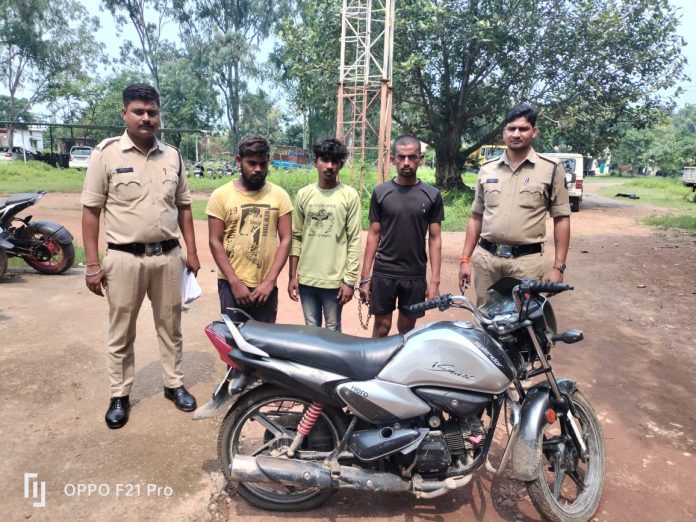 बिलासपुर सीपत थाना क्षेत्र का मामला मामले का संक्षिप्त विवरण इस प्रकार हैं कि प्रार्थी वेदप्रकाश टंडन पिता मालिक राम टंडन उम्र 30 साल निवासी रांक थाना आकर रिपोर्ट दर्ज कराया कि दिनांक 18.09.2023 को शाम करीबन 04.00 बजे अपने मो0सा0 हिरो आई स्मार्ट क्रमांक सीजी 10 एक्स 8891 को रांक डेम के पास खड़ा करके काम करने रांक 01 नंबर डेम मे गया था । शाम करीबन 07.40 बजे काम करके वापस अपने मो०सा० के पास आकर देखा तो जहां पर मोटर सायकल खड़ा कर रखा था मो०सा० नही था जिसका आसपास पता तलास किया पता नही चला मेरी पुरानी इस्तेमाली मो०सा० हिरो आई स्मार्ट क्रमांक सीजी 10 एक्स 8891 जिसका चेचिस नंबर MBLHA12ACE9M13964 इंजन HA12EME9M14339 कीमती 15000 रूपये को कोई अज्ञात चोर चोरी कर ले गया है कि रिपोर्ट पर अपराध कायम कर विवेचना में लिया गया था । विवेचना के दौरान मुखबीर सूचना मिली की ग्राम नवाडीह सीपत मे तीन व्यक्ति चोरी का मोटर सायकल को बेचने की फिराक में ग्राहक की तलाश कर रहे थें जिसकी सूचना श्रीमान पुलिस अधीक्षक महोदय संतोष कुमार सिंह (भापुसे), अतिरिक्त पुलिस अधीक्षक महोदय ग्रामीण एवं उप पुलिस अधीक्षक सी. डी. लहरे एस. जे. पी.यु. बिलासपुर महोदय को देने पश्चात मार्गदर्शन प्राप्त कर विशेष टीम बनाकर घेरा बंदी किये जो ग्राम मटियारी की ओर से एक मोटर सायकल मे तीन व्यक्ति आते मिला जिसे रोककर नाम पता पूछने पर अपना नाम अनिकेत साहू चंद्रशेखर पटेल एवं निलेश साहू साकिनान खैरा लगरा हो होना बताया जिससे बारिकी से पूछताछ किया गया जो उक्त मोटर सायकल हिरो आई स्मार्ट क्रमांक सीजी 10 एक्स 8891 को रांक राखड डेम के पास से चोरी करना बताये जो आरोपीगण को थाना लाकर विधिवत दिनांक 26.09.2023 के 10.40,10. 50, एवं 11.00 बजें गिर कर माननीय न्यायालय बिलासपुर में पेश किया गया है।उक्त कार्यवाही में निरीक्षक नरेश कुमार चौहान सउनि बृजमोहन कश्यप आर. शरद साहू ,धीरज कश्यप , रोहित टंडन मुकेश की विशेष भूमिका रही।