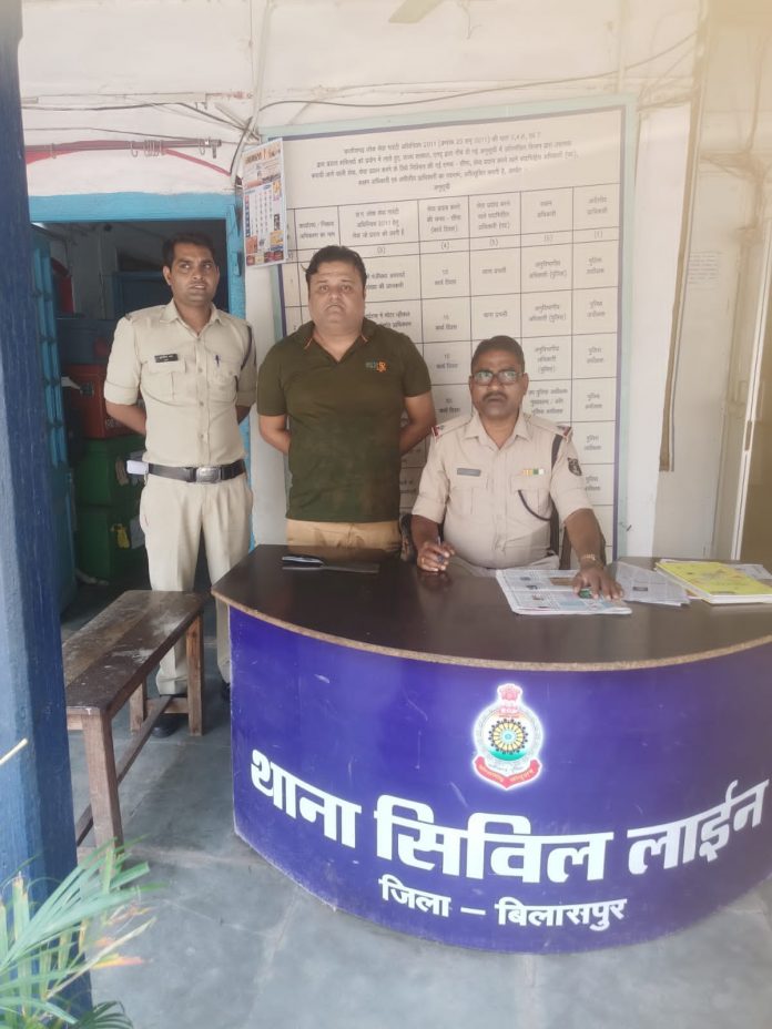 बिलासपुर/- सिविल लाइन थाना क्षेत्र का मामला विवरण इस प्रकार है कि दिनांक 02/03/2024 को थाना प्रभारी सिविल लाइन प्रदीप आर्य को सूचना मिला कि हेवन्स पार्क होटल में एक व्यक्ति लोहे का चापड लेकर कर्मचारी/ ग्राहकों को डरा धमका रहा है कि सूचना से तत्काल पुलिस अधीक्षक महोदय रजनेश सिंह को अवगत कराया गया जिनके द्वारा उक्त व्यक्ति के विरुद्ध तत्काल कार्यवाही करने के दिए गये निर्देश के पालन में अतिरिक्त पुलिस अधीक्षक महोदय शहर राजेन्द्र जायसवाल, नगर पुलिस अधीक्षक सिविल लाईन उमेश प्रसाद गुप्ता (भा.पु.से.), के मार्गदर्शन में थाना प्रभारी प्रदीप आर्य एवं हमराह स्टाफ के द्वारा तत्काल मौके पर पहुंच कर आरोपी हरि ओम अग्रवाल पिता स्व. नारायण प्रसाद अग्रवाल उम्र 44 वर्ष निवासी छपरी गंज पंजाब नेशनल बैंक के पीछे खरसिया रायगढ़ के कब्जे से एक नग लोहे का चापड़ जप्त कर आरोपी को गिरफ्तार कर आर्म्स एक्ट के तहत कार्यवाही कर माननीय न्यायालय के समक्ष प्रस्तुत किया गया है।
