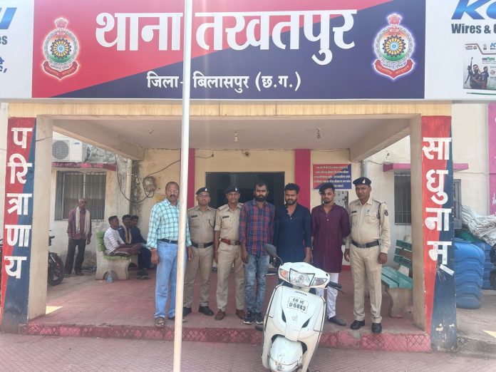 बिलासपुर तखतपुर थाना क्षेत्र की घटना मामले का संक्षिप्त विवरण इस प्रकार है कि दिनांक 10-05-2024 को प्रार्थी ने मेडिकल स्टोर को रात्रि में बंद कर घर जा जाने के लिए अपने एक्टीवा वाहन क्रमांक CG 10 U 5883 को चालु किया तो चालू नही हुआ , तो अपनी वाहन को लॉक कर अपने घर चला गया।देर रात प्रार्थी को पता चला कि उसकी एक्टिवा चोरी हो गई है। और एक्टीवा को 03 व्यक्ति बिलासपुर रोड की ओर ले जा रहे सूचना प्राप्त होने पर प्रार्थी द्वारा उक्त घटना की जानकारी थाना प्रभारी को दिया गयी । थाना प्रभारी निरीक्षक हरिश चंद्र टांडेकर के नेतृत्व में टीम द्वारा त्वरित कार्यवाही करते हुये घेराबंदी कर आरोपिगणों को चोरी हुए मोटर सायकल एक्टीवा क्रमांक CG 10 U 5883 किमती 20000 रूपमे मे भागते हुए हाईस्कुल तखतपुर के पास पकडा गया। जिसे थाना लाकर कडाई से पुछताछ करने पर तीनो व्यक्ति चोरी करने के नियत से प्लान बनाकर आना और मोटर सायकल को चोरी करना स्वीकार किये जिनसे चोरी गई मोटर सायकल एक्टीवा ,मास्टर चाबी व घटना मे प्रयुक्त मोटरसायकल पेशन प्रो क्रमांक CG 10 AG 4263 को जप्त कर आरोपियों को गिरफ्तार कर न्यायिक रिमाण्ड पर भेजा गया है।