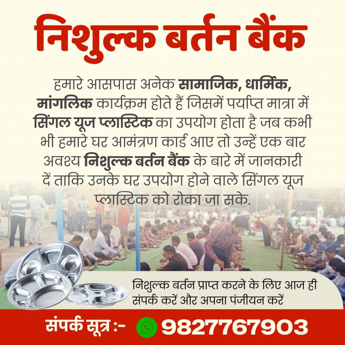 जो की बिलासपुर संभाग का पहला निःशुल्क बर्तन बैंक है मई माह में शुरुवात हुवे इस निःशुल्क बर्तन बैंक के माध्यम से महज कुछ महीनो में ही यह सेवा जन जन तक पहुंचने लगा है 30 से अधिक सामाजिक धार्मिक कार्यक्रमों में सेवा दे चुके निःशुल्क बर्तन के माध्यम से लगभग 900 किलो प्लास्टिक जिसे पर्यावरण को दूषित होने से बचाया जा चुका है यह सेवा अनवरत जारी है बिलासपुर समेत आस पास के अनेक शहरों में भी बर्तनों का सेवा लगातार जा रहा है, ज्ञात हो विगत माह 130 किमी सफर कर बर्तन बिलासपुर से गिरौधपूरी धाम एक दशगात्र कार्यक्रम में सेवा देकर आ चुकी है शहर के समीप जगशाला आश्रम (पौंसरा) में आयोजित विशाल भंडारा में लगभग 1100 लोगो ने निःशुल्क बर्तन बैंक के माध्यम से उपलब्ध थाली, ग्लास से भोजन प्रसादी प्राप्त किया, अब तक अनेक सेवा के माध्यम से लगभग 14190 लोगो ने इस सेवा का लाभ लिया है,इसी प्रकार अनेक सुख, दुख, धार्मिक, सामाजिक कार्यक्रमों में यह बर्तन सेवा प्रदान कर रहा है संस्था के संस्थापक ने आम जन से अपील किया है की इस निःशुल्क बर्तन बैंक का अधिक से अधिक लाभ ले और प्लास्टिक रूपी दानव को समाज, देश, पर्यावरण, तालाब, कुंआ, नदी, नालों को दूषित होने से बचाने में सहयोग करें संस्था प्रमुख ने बताया की छोटे-छोटे मांगलिक कार्यों में लोग थर्माकोल और प्लास्टिक के बर्तन उपयोग करते हैं, जिससे पर्यावरण को नुकसान होता है। इसमें कई चीजें प्लास्टिक की होती हैं। हमने बर्तन बैंक की शुरुआत उन लोगों के लिए की है जो इसका इस्तेमाल करने के बाद नो प्लास्टिक मिशन को बढ़ावा दें।यह सेवा कोई भी आम जन 24 घंटे पूर्व बुकिंग करा के ले सकता है 9827767903 इस नंबर के माध्यम से आप बर्तन का सेवा ले सकते है।