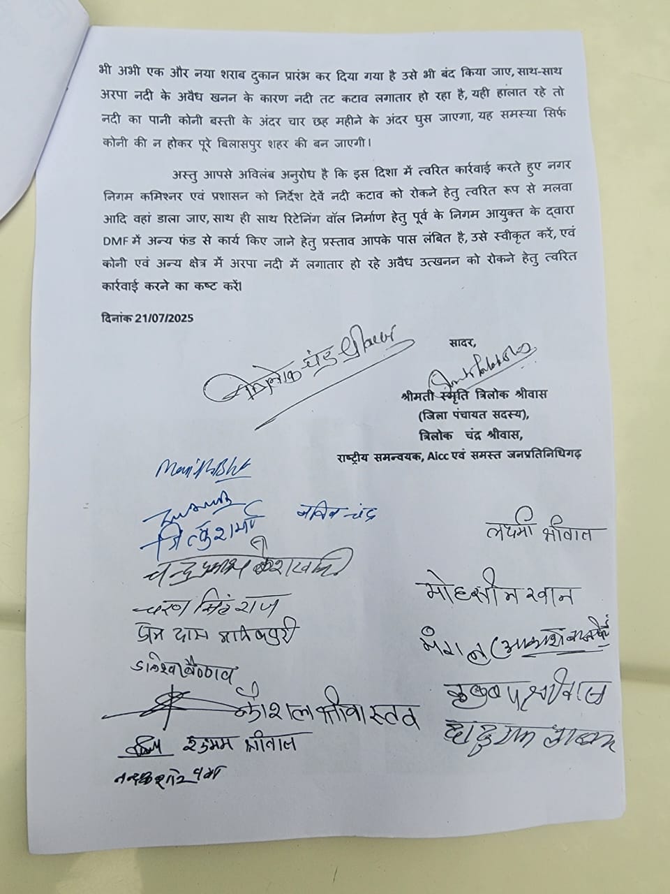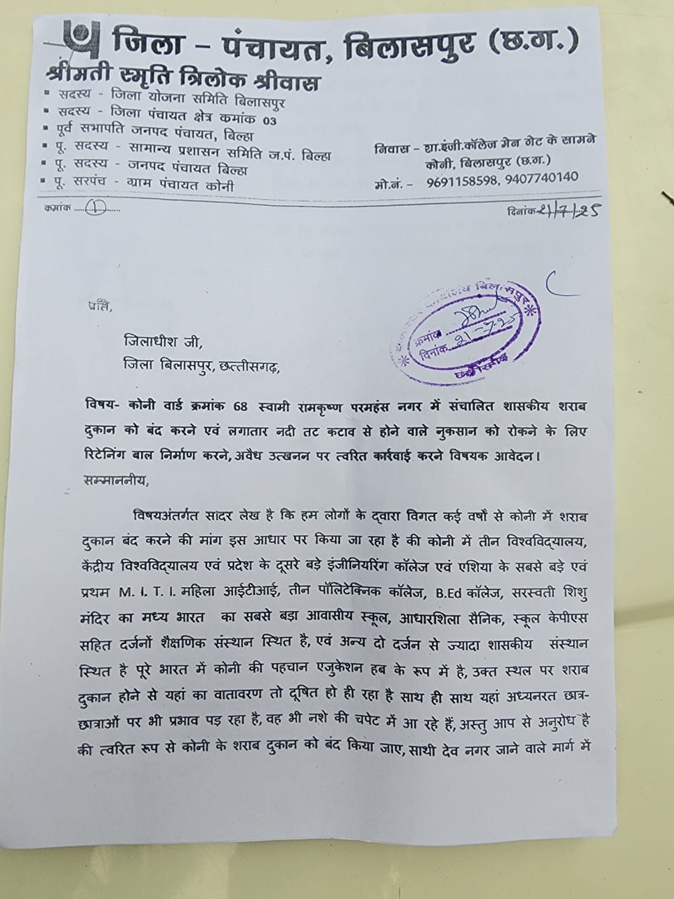 बिलासपुर जिले के लोकप्रिय कांग्रेस नेता श्री, त्रिलोक चंद्र श्रीवास, राष्ट्रीय समन्वयक, अखिल भारतीय कांग्रेस कमेटी, प्रभारी – उत्तर प्रदेश तथा गुजरात, मार्गदर्शक- जिला पंचायत सदस्य क्षेत्र क्रमांक- 3 ने आज अपने दर्जनों सहयोगियों जनप्रतिनिधियों के साथ बिलासपुर जिलाधीश श्री संजय अग्रवाल से भेंट किया एवं उन्हें एजुकेशन हब कोनी में तत्काल रूप से शराब दुकान को बंद करने अरपा नदी में अवैध उत्खनन रोकने एवं अवैध उत्खनन से कोनी में हो रहे नदी तट कटाव पर तट बंधन रिटर्निंग बाल निर्माण करने संबंधी मांगों का ज्ञापन सोपा, इस अवसर पर त्रिलोक श्रीवास ने कहा कि कोनी वार्ड क्रमांक 68 स्वामी रामकृष्ण परमहंस नगर में तीन विश्वविद्यालय स्थित है, एशिया महाद्वीप में ऐसा कोई स्थल नहीं है जहां एक वार्ड में तीन विश्वविद्यालय हो, यहां एशिया का सबसे बड़ा और सर्वप्रथम M. I. T. I. महिला आईटीआई तीन पॉलिटेक्निक कॉलेज डीपी कॉलेज का B.Ed कॉलेज प्रदेश का दूसरा सबसे बड़ा इंजीनियरिंग मेडिकल विभाग कॉलेज आधारशिला सैनिक स्कूल केपीएस स्कूल सहित मध्य भारत प्रांत का सरस्वती शिशु मंदिर का सबसे वृहद और बड़ा आवासीय विद्यालय एवं सरस्वती महाविद्यालय जैसे दर्जनों शैक्षणिक संस्थान एवं दो दर्जन से ज्यादा अन्य शासकीय संस्थान स्थित है, पूरे देश से एवं प्रवासी भारतीय भी छात्र-छात्राएं वहां हजारों की तादाद में रहते हैं, शिक्षा के मंदिर के तले शराब दुकान होना विडंबना की बात है, विगत कई वर्षों से लगातार कोनी क्षेत्र में शराब दुकान बंद करने की मांग कर रहे हैं, उन्होंने जिलाधीश से अविलंब शराब दुकान को बंद करने की मांग किया है, साथ ही साथ उन्होंने अरपा नदी में हो रहे अवैध उत्खनन के कारण कोनी क्षेत्र में लगातार नदी तट कटाव हो रहे हैं, जिससे भयावह समस्या उत्पन्न हो गई है, नदी तट कटाव रोकने के लिए रिटेनिंग वॉल, पचरी निर्माण करने का मांग किया गया है, इस अवसर पर कांग्रेस नेता श्री त्रिलोक चंद्र श्रीवास एवं उनके सहयोगियों ने कहा कि यदि प्रशासन त्वरित रूप से इन मांगों पर कार्रवाई नहीं करता तो वह वृहद रूप से जन आंदोलन करने हेतु बाध्य रहेंगे, इस अवसर पर श्री त्रिलोक श्रीवास के साथ कांग्रेस नेता नंदकिशोर वर्मा मनोज श्रीवास मंगल बाजपेई पंडित जितेंद्र शर्मा जीतू चंद्र प्रकाश केसरवानी कौशल श्रीवास्तव चरण सिंह राज शुभम श्रीवास पप्पू मानिक पुरी , मनीष भट्ट दौलत सोनी मोहसिन खान राहुल गोरख आयुष सिंह राज कृष्ण श्रीवास मोहन जायसवाल मुकेश अग्रवाल नवीन चंद्र दुबे रामेश्वर केसरी दीपक कश्यप ओमप्रकाश शर्मा विजय तिवारी दिनेश कश्यप सहित दर्जनों लोग उपस्थित थे ll