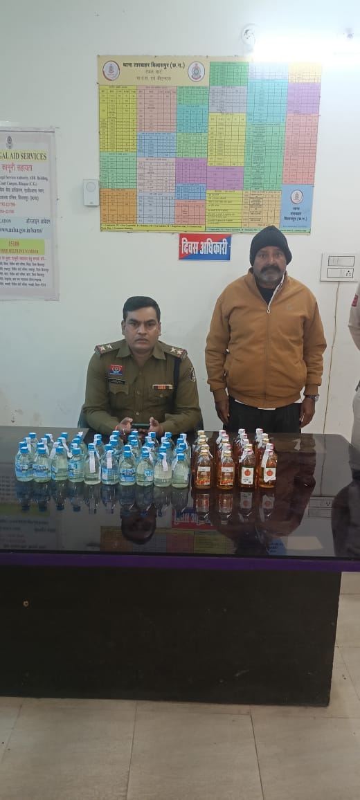 बिलासपुर – मामले का संक्षिप्त विवरण इस प्रकार है कि जिले में अवैध मदिरा की खरीदी बिक्री की शिकायत एवं इससे बढ़ते अपराध एवं चेतना अभियान के तहत रोकथाम एवं कड़ी कार्यवही हेतु वरिष्ठ पुलिस अधीक्षक महोदय बिलासपुर रजनेश सिंह (भापुसे) के द्वारा आवश्यक दिशा निर्देश दिये गया था जिनके निर्देशानुसार अतिरिक्त पुलिस अधीक्षक महोदय (शहर) बिलासपुर राजेन्द्र जायसवाल एवं नगर पुलिस अधीक्षक सिविल लाईन निमितेश सिंह के मार्गदर्शन पर निरी कृष्णचंद सिदार थाना प्रभारी थाना तारबाहर के नेतृत्व में टीम बनाकर अवैध रूप शराब की बिक्री करने वाले आरोपीयो कि पतासाती हेतु रवाना हुये थे कि मुखबीर से सूचना मिला कि एक व्यक्ति स्कूटी में देशी मंदिरा प्लेन एवं मसाला शराब अवैध रूप से बिक्री करने के लिये ले जा रहा कि सूचना पर तत्काल सीएमडी चैक के आगे स्वदेशी प्लाजा पहुचकर घेराबंदी कर एक व्यक्ति एक्टिवा क्रमांक सी जी 10 बी डी 3328 को रोककर चेक करने पर उसके थैला एवं डिक्की से 65 नग देशी प्रत्येक में 180 एमएल भरा हुआ मिला आरोपी के कब्जे से कुल 65 नग शराब एवं एक्टिवा क्रमांक सी जी 10 बी डी 3328 को जप्त कर आरोपी को गिरफ्तार कर न्यायिक रिमांड पर जेल दाखिल किया गया है।