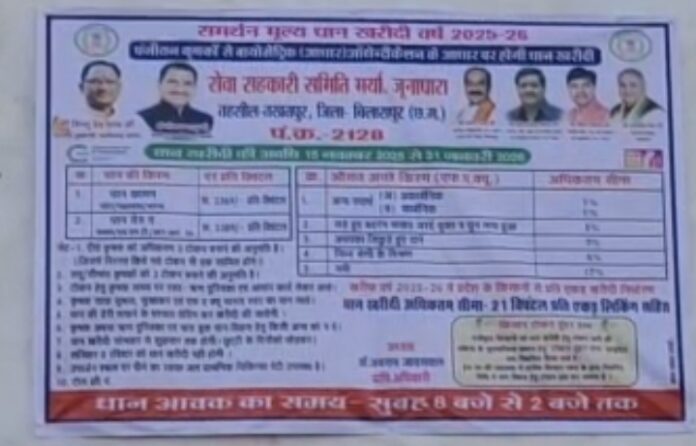 तखतपुर तहसील अंतर्गत सेवा सहकारी समिति मर्या जूनापारा में किसानों से अवैध वसूली किए जाने का गंभीर मामला सामने आया है। किसानों द्वारा प्राप्त जानकारी के अनुसार समिति में कार्यरत हमालों द्वारा प्रति बोरी 5 रुपये की अवैध वसूली की जा रही है, जिससे किसानों को आर्थिक नुकसान उठाना पड़ रहा है।