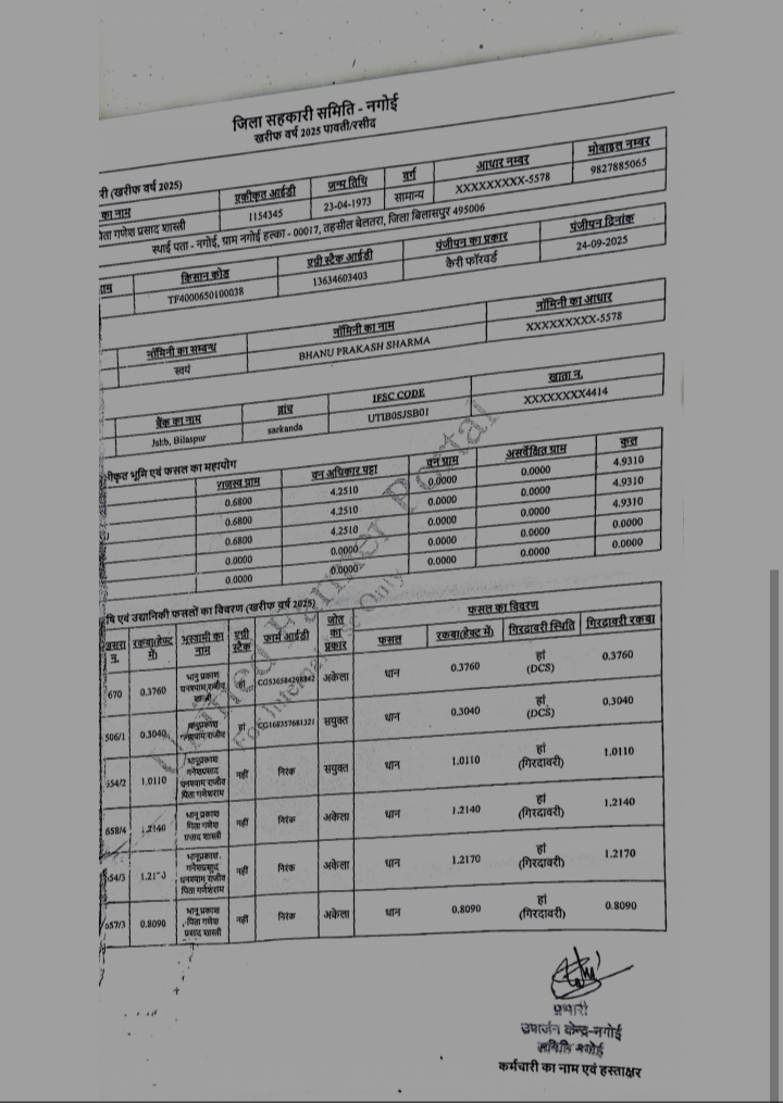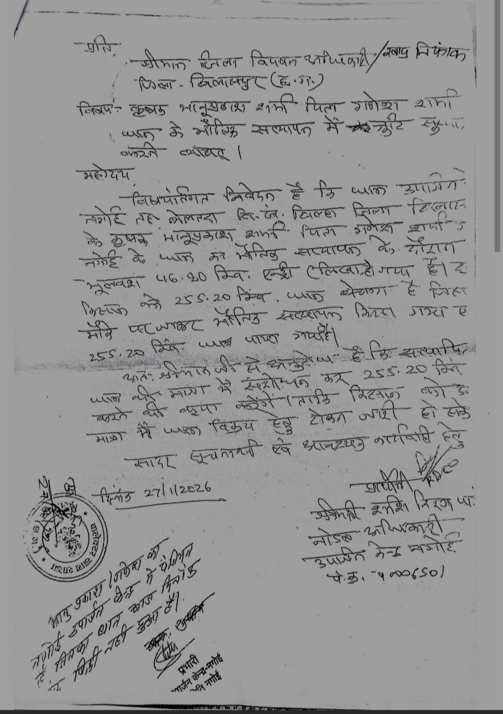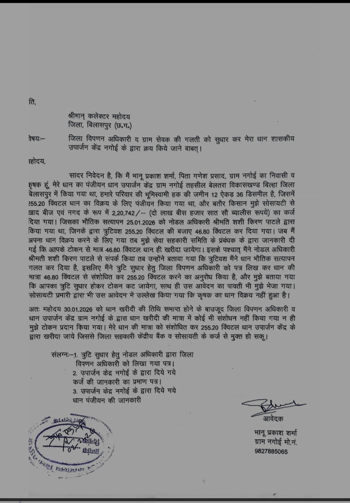 छत्तीसगढ़ सरकार द्वारा धान खरीदी को ऐतिहासिक बताए जाने के दावों के बीच ज़मीनी स्तर पर किसान आज भी परेशान हैं। बेलतरा विधानसभा क्षेत्र अंतर्गत ग्राम नगोई के किसान भानु प्रकाश शर्मा का मामला धान खरीदी व्यवस्था में गंभीर प्रशासनिक लापरवाही और असंवेदनशीलता को उजागर करता है।किसान भानु प्रकाश शर्मा ने बताया कि उन्होंने शासन के नियमों के तहत धान उपार्जन केंद्र नगाई में अपनी उपज का पंजीयन कराया था। कुल 12 एकड़ 36 डिसमिल भूमि के आधार पर 255.20 क्विंटल धान विक्रय हेतु पंजीकृत किया गया था। इसके बावजूद भौतिक सत्यापन में नोडल अधिकारी द्वारा भारी त्रुटि करते हुए धान की मात्रा को मात्र 46.80 क्विंटल दर्शा दिया गया।इस गलती को सुधारने के लिए किसान द्वारा समय रहते संबंधित अधिकारियों को आवेदन दिया गया। नोडल अधिकारी ने स्वयं त्रुटि स्वीकार करते हुए जिला विपणन अधिकारी को सुधार हेतु पत्र भी प्रेषित किया, जिसकी पावती भी किसान को दी गई। इसके बावजूद 30 जनवरी 2026 को धान खरीदी की अंतिम तिथि समाप्त हो जाने के बाद भी न तो त्रुटि सुधारी गई और न ही किसान को टोकन प्रदान किया गया। धान विक्रय न हो पाने के कारण किसान पर सहकारी समिति एवं बैंक का ₹2,20,742 का कर्ज बना हुआ है, जिससे उन्हें मानसिक, आर्थिक और सामाजिक परेशानी का सामना करना पड़ रहा है।कांग्रेस नेता अंकित गौरहा ने इस मुद्दे पर तीखी प्रतिक्रिया देते हुए कहा—