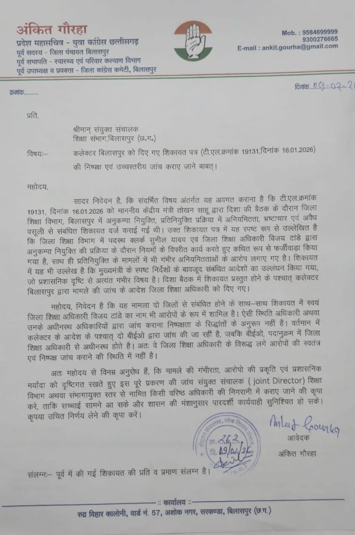 बिलासपुर। जिला शिक्षा विभाग में अनुकंपा नियुक्ति को लेकर कथित फर्जीवाड़े का मामला अब संभागीय स्तर तक पहुंच गया है। वरिष्ठ कांग्रेस नेता अंकित गौरहा ने संयुक्त संचालक शिक्षा विभाग आरपी आदित्य से मुलाकात कर पूरे प्रकरण की निष्पक्ष और शीघ्र जांच कराने की मांग की है। उन्होंने चेतावनी दी कि यदि जांच में देरी हुई या मामले को दबाने की कोशिश की गई तो वह इस मुद्दे को हाईकोर्ट तक ले जाएंगे।