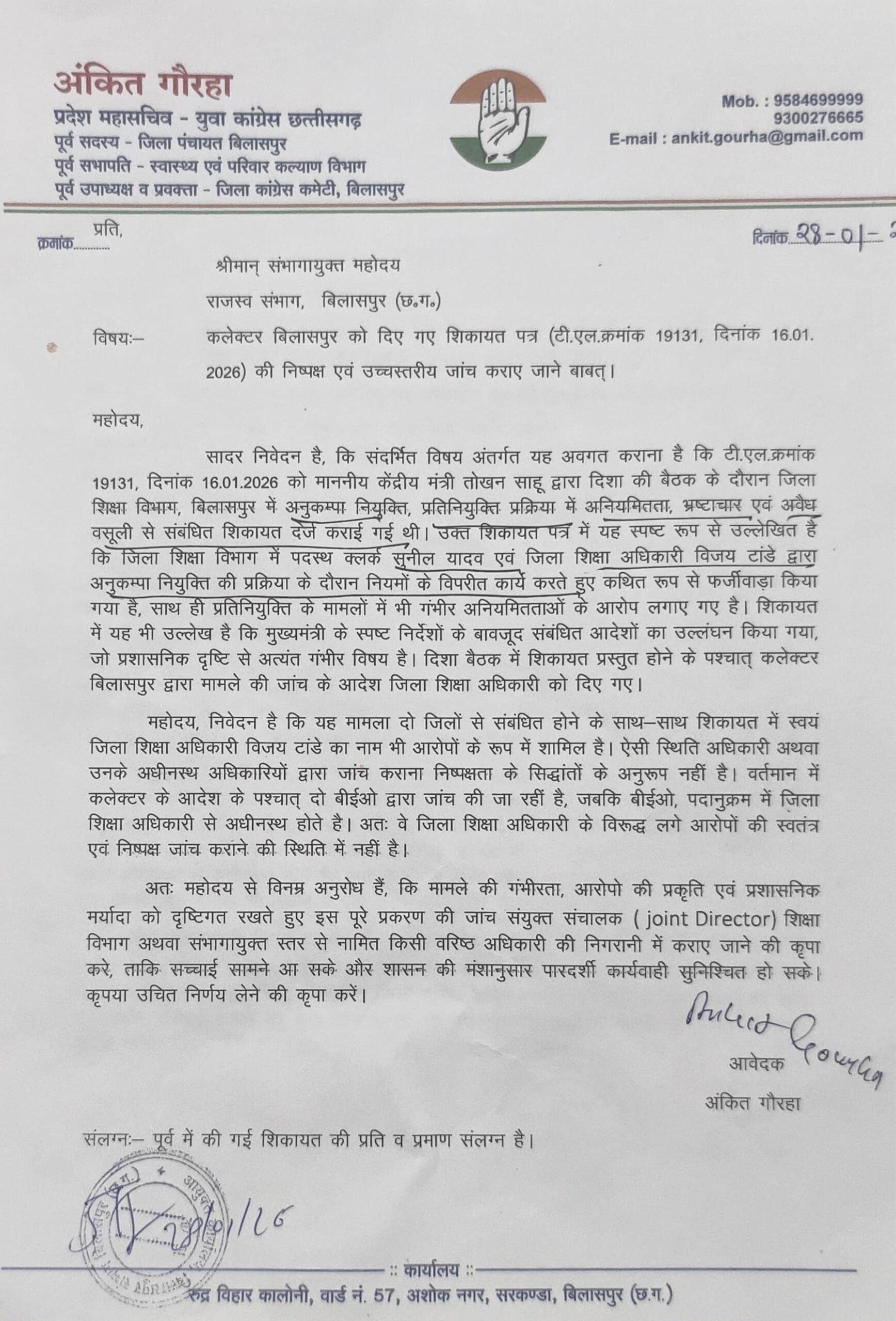 अंकित गौरहा ने आरोप लगाया कि जिला शिक्षा विभाग में एक दर्जन से अधिक अनुकंपा नियुक्ति प्रकरणों में गंभीर अनियमितताएं सामने आई हैं। आरोप है कि पात्र आवेदकों को दरकिनार कर अपात्र लोगों को नौकरी दी गई और इस पूरी प्रक्रिया में कथित तौर पर भारी लेन-देन हुआ है।
