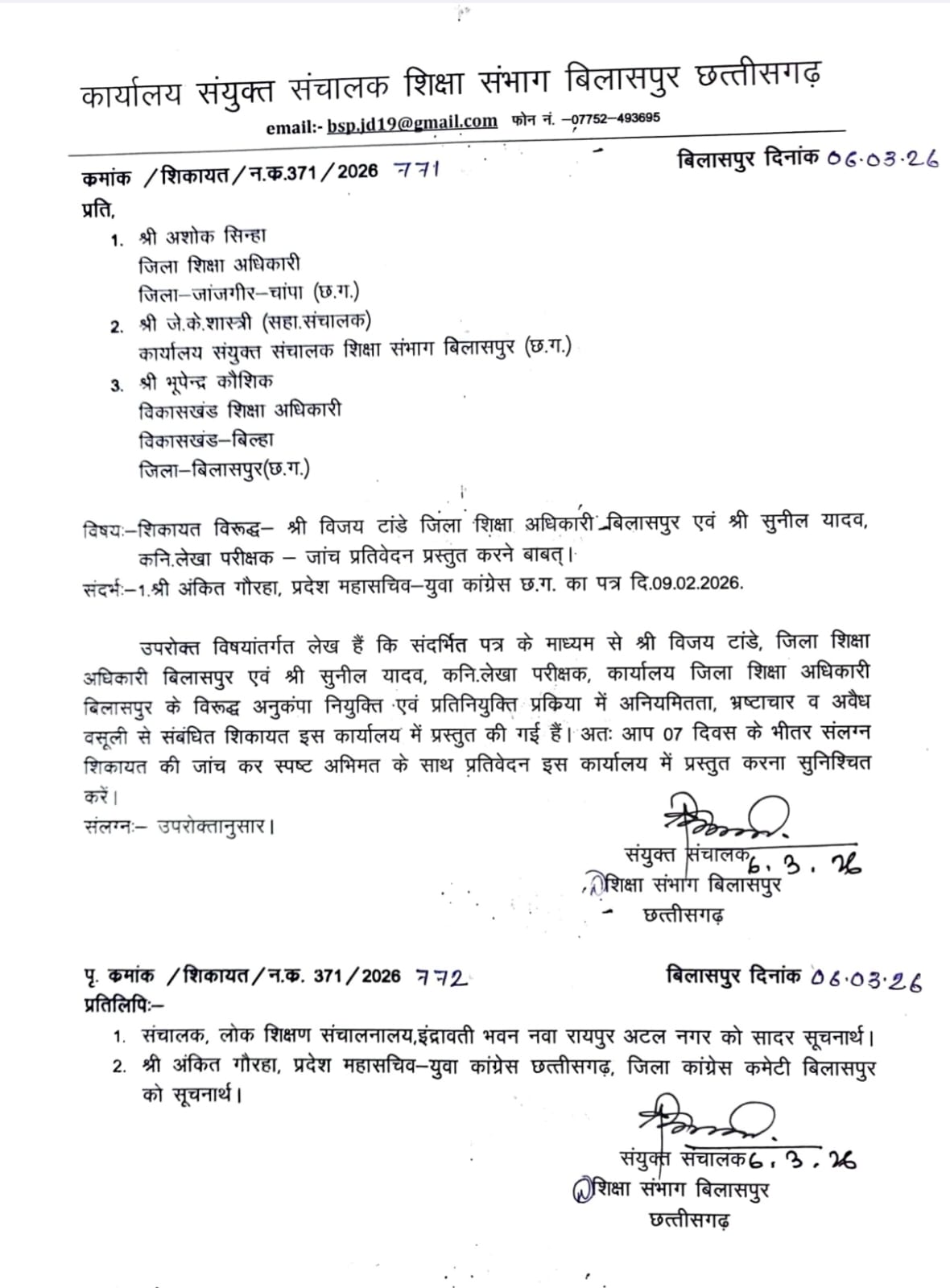 बिलासपुर -:- जिला शिक्षा विभाग में नियुक्ति, अटैचमेंट और प्रमोशन में कथित भ्रष्टाचार के आरोपों ने अब नया मोड़ ले लिया है। कांग्रेस नेता अंकित गौराहा की शिकायत के बाद संभागीय संयुक्त संचालक शिक्षा आर.पी.आदित्य ने जिला शिक्षा अधिकारी विजय टांडे और स्थापना शाखा के बाबू सुनील यादव के खिलाफ जांच के आदेश जारी किए हैं। इसके लिए तीन सदस्यीय जांच समिति का गठन किया गया है,जिसे सात दिन के भीतर रिपोर्ट प्रस्तुत करने का निर्देश दिया गया है।