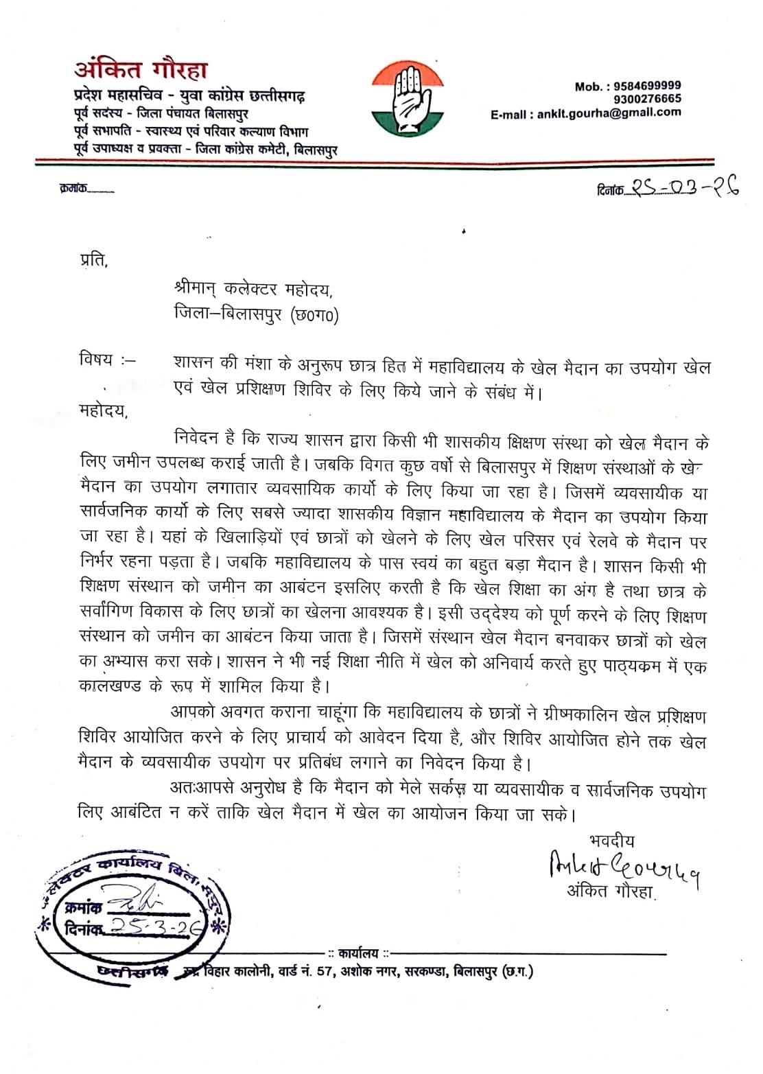मामले ने तब और तूल पकड़ा जब कांग्रेस नेता अंकित गौरहा ने इस मुद्दे को उठाते हुए जिला कलेक्टर को ज्ञापन सौंपा। उन्होंने साफ शब्दों में कहा कि महाविद्यालय की परिसंपत्तियों पर पहला अधिकार छात्रों का है और इसमें किसी भी प्रकार की लापरवाही स्वीकार नहीं की जाएगी।